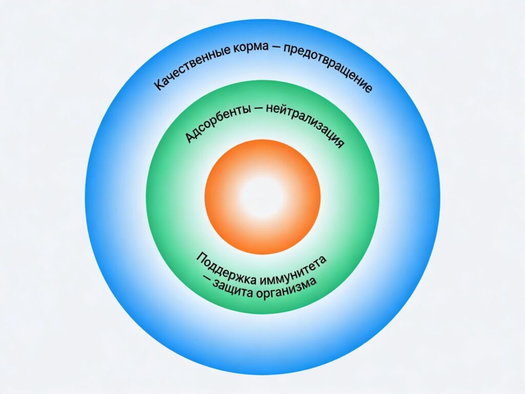 Эффективная защита телят строится на трёх уровнях: предотвращение попадания токсинов в корма, нейтрализация уже присутствующих токсинов и поддержка организма для минимизации последствий.