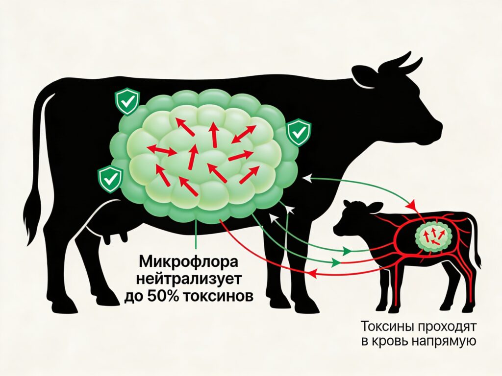 Взрослая корова обладает тремя линиями защиты от микотоксинов: рубцовая микрофлора частично разрушает токсины, печень нейтрализует оставшиеся, а иммунная система справляется с последствиями. У телят до 4–6 месяцев ни одна из этих систем не работает в полную силу.