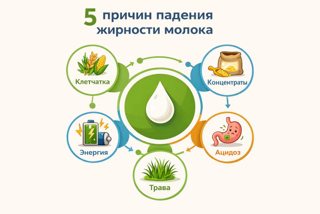 Лаборатория показала 3,2% вместо привычных 3,8%? Падение жирности молока — сигнал о нарушениях в рубце, которые можно исправить коррекцией рациона. Разберём причины и дадим практические решения.