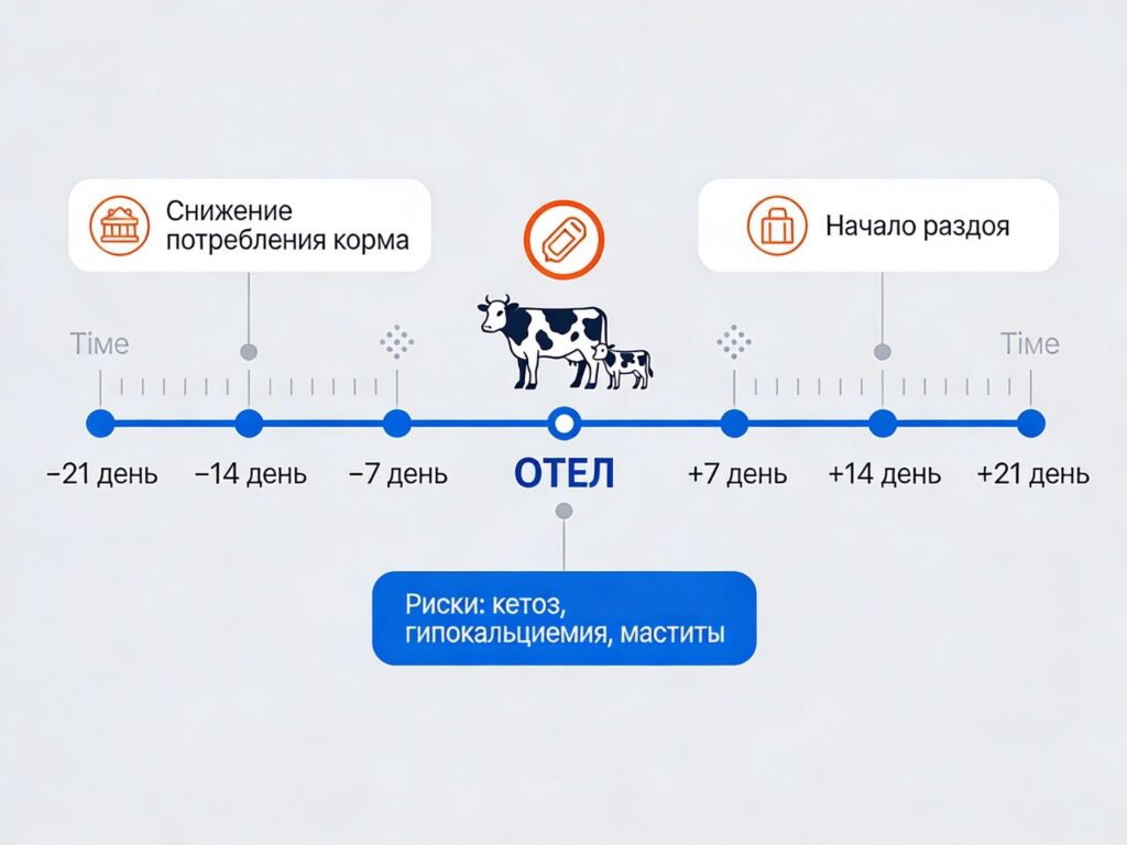 Каждая третья корова в вашем хозяйстве рискует столкнуться с метаболическими нарушениями в первые три недели после отела. Кетоз, гипокальциемия, маститы — это не случайность, а следствие физиологического стресса транзитного периода. По статистике, до 60% всех заболеваний молочного стада приходится именно на эти критические шесть недель: три недели до отела и три недели после. Но есть способ превратить эту зону риска в возможность заложить основу рекордных надоев на всю лактацию.